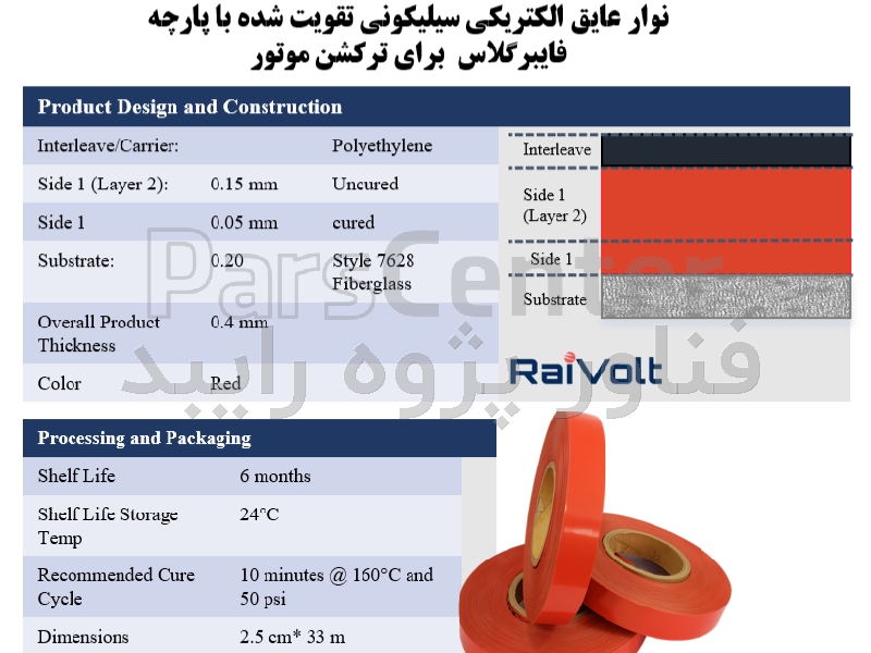 یک نوار عایق سیلیکونی تقویت شده با فایبر گلاس است که دارای استحکام دی الکتریک ۸ کیلو ولت می باشد و برای عایق بندی کویل هاب الکتریکی استفاده می شود. ضخامت محصول ۰.۴ میلی متر است که ۰.۲ میلی متر آن سیلیکون است. این محصول قابلیت پخت درجا (دمای ۱۶۰ درجه سانتی گراد به مدت ۱۰ دقیقه) برای اتصال بهتر به سطوح فلزی را داراست. ابعاد یک رول شامل عرض ۲۵ میلی متر در طول ۳۳ متر می باشد.