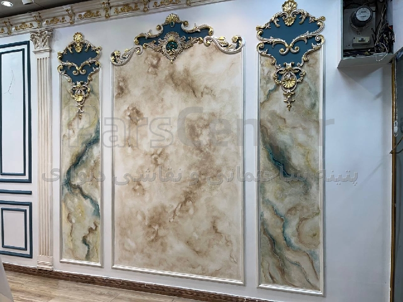 ✔️ **قابها و گچبریها** با ترکیبی از **رنگ صدفی و ورق طلا** پوشش داده شدهاند تا عمق و درخشش بیشتری به کار داده شود.