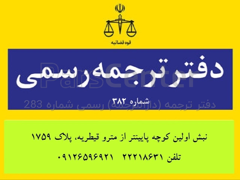 دارالترجمه (دفتر ترجمه) رسمی 382 واقع در شریعتی، نبش کارامیان (اولین کوچه پایین تر از مترو قیطریه) پلاک 1759 خدمات ترجمه رسمی فوری خود را در اسرع وقت به کلیه همشهریان محترم به ویژه در مناطق همجوار در شمال تهران از جمله الهیه، قیطریه، فرمانیه، کامرانیه، چیذر، تجریش، صدر، بلوار کاوه، اندرزگو، پاسداران و منطقه دزاشیب ارائه می نماید.
