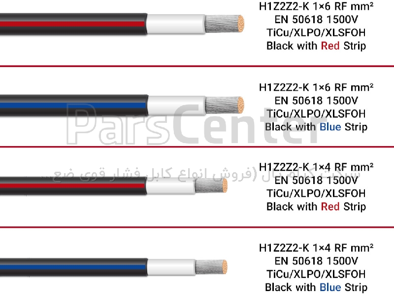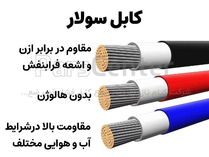 کابل سولار یا کابل خورشیدی مناسب برای پنل های خورشیدی خانگی ، صنعتی و نیروگاهی مقاوم در برابر ازون و اشعه فرابنفش 1.5 کیلوولت بدون هالوژن سطح مقطع 4*1 تا 240*1