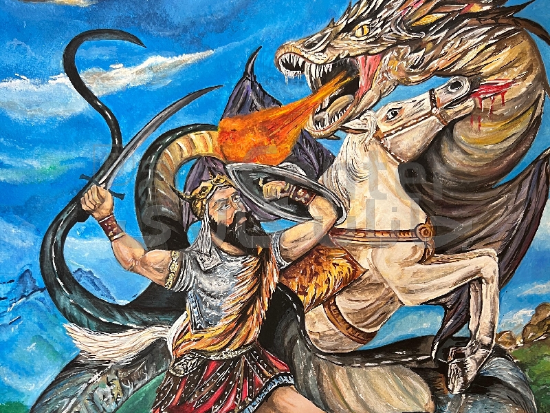 تابلو نقاشی نبرد اهریمن کارشده با گواش روی مقوای فابریانو گرم بالا ، استفاده شده از رنگهای با کیفیت خارجی ، تابلو نقاشی، تابلو نقاشی ایرانی ، نقاشی رستم ، نقاشی شاهنامه ای ، نقاشی رستم شاهنامه ، رستم و سهراب ، شاهنامه ، نگارگری ، مینیاتور