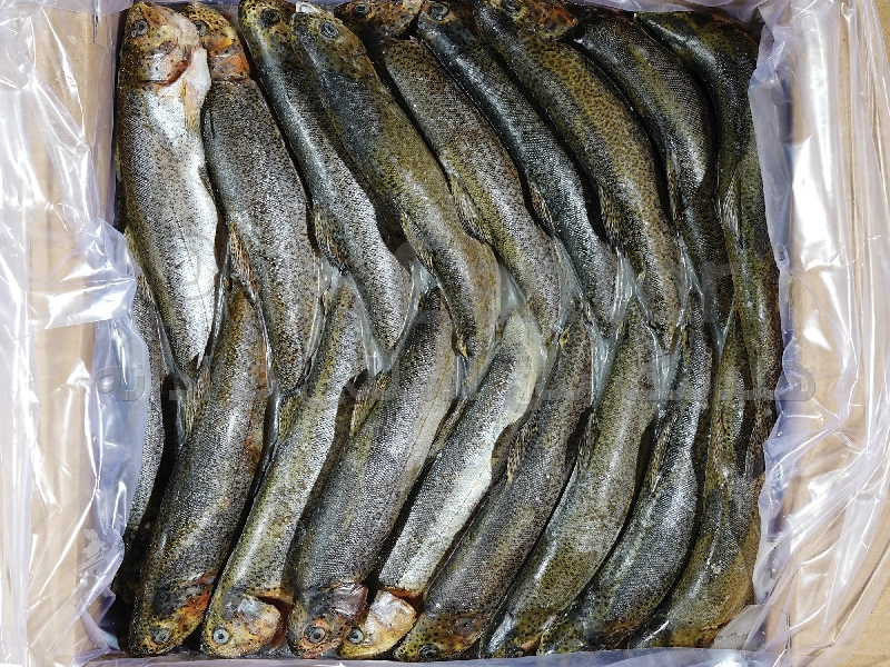 ماهی قزل آلای شکم خالی منجمد(استخوان دارد) در سایز ال 7 تا ال 15 و سایز درشت(1000-1500گرم و 1000تا2500گرم) در کارتن های 5 و 10 کیلویی تغذیه شده با خوراک فرادانه و IQF(انجماد سریع)