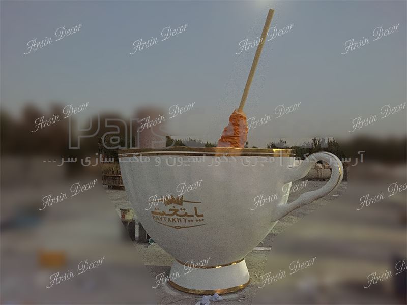 ماکت فنجان نبات پایتخت در گروه صنعتی آرسین دکور در مدت زمان هشت روز کاری طراحی و ساخته شده است. ابعاد ماکت فنجان در حدود دو متر ارتفاع و سه متر پهنا می باشد. جنس به کار گرفته شده در این پروژه به واسطه استفاده در محیط باز تماما از فایبرگلاس بسیار مستحکم می باشد. وزن تقریبی ماکت فنجان در حدود یکصد و بیست کیلوگرم می باشد. ابعاد ماکت نبات قرار گرفته در داخل فنجان در حدود یک و نیم متر می باشد. این ماکت به سفارش شرکت نبات پایتخت طراحی و ساخته شده است.