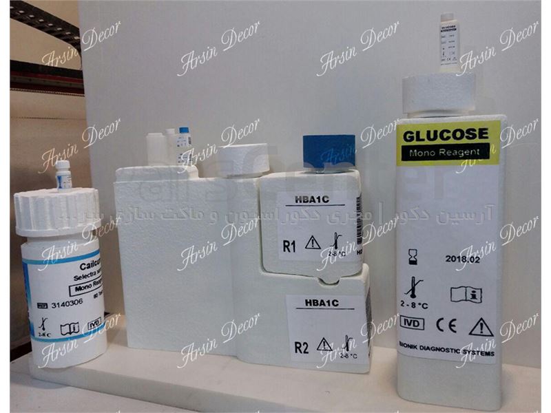 ماکت تبلیغاتی لوازم آزمایشگاهی در مجموعه آرسین دکور در مدت زمان ۱۰ ساعت طراحی و اجرا شده است که خود یک رکورد برای این مجموعه محسوب می شود. ابعاد ماکت ها با اسکیل یا نسبت ۱ به ۸ می باشد. جنس کلیه ماکت ها به سفارش خود کارفرما فوم خام (فوم مخصوص ماکت سازی با دانسیته بالا) بدون هیچگونه روکشی می باشد(محدودیت در زمان اجرا) {شما می توانید جنس های ویژه ی ما را در صفحه نمونه کارها ملاحظه نمایید} کیفیت پایین چاپ به عهده و سفارش خود کارفرما بوده است. وزن تقریبی هر یک از ماکت ها در حدود ۸۰۰ گرم می باشد. این پروژه در نمایشگاه تجهیزات پزشکی دانشگاه شهید بهشتی به کار برده شده است.