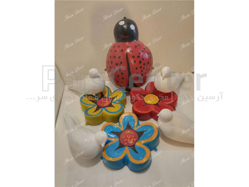 ماکت گل، کبوتر و کفشدوزک ویژه نمای مهدکودک در گروه صنعتی آرسین دکور در مدت زمان چهار روز کاری طراحی و اجرا شده است. جنس کلیه ماکت ها فایبرگلاس می باشد که در برابر ضربه، رطوبت و نور خورشید بسیار مقاوم می باشد. ابعاد تقریبی هر یک از ماکت های گل در حدود چهل سانتی متر و ماکت های کبوتر در حدود پنجاه سانتی متر و ماکت کفشدوزک در حدود چهل سانتی متر می باشد. وزن تقریبی هر یک از ماکت ها زیر سیصد گرم می باشد. کلیه ماکت ها از لحاظ رنگ بندی و نوع چهره می تواند بنا به سفارش شما تغییر کند.
