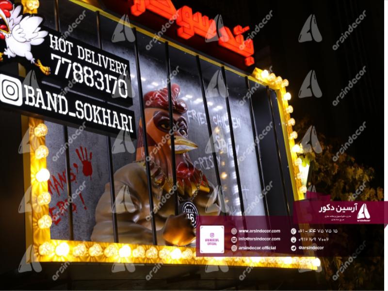 ماکت تبلیغاتی خروس بزرگ در تاریخ مرداد ماه ۱۳۹۸ به مدت ۳۰ روز توسط گروه صنعتی آرسین دکور طراحی و ساخته شده است. ماکت های صنعتی و تبلیغاتی خروس بزرگ به سفارش فست فود بند سوخاری ساخته شده است. در این سازه از متریال فایبرگلاس شش لایه استفاده شده است. رنگ به کار گرفته شده صنعتی و خودرویی و مناسب جهت استفاده در فضای باز و سرپوشیده و مقاوم در برابر اشعه UV و رطوبت می باشد. تمام مراحل مدل سازی و قالبگیری ماکت های صنعتی و تبلیغاتی خروس بزرگ توسط دستگاه های CNC تمام اتوماتیک با بالاترین دقت انجام گرفته است.