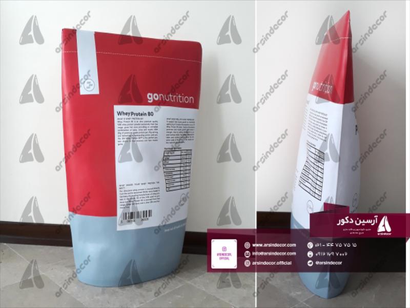 ماکت بسته پودر پروتئین در تاریخ آذر ماه ۱۳۹۸ به مدت ۱۶ روز توسط گروه صنعتی آرسین دکور طراحی و ساخته شده است. در این سازه از متریال فایبرگلاس شش لایه استفاده شده است. رنگ به کار گرفته شده صنعتی و خودرویی و مناسب جهت استفاده در فضای باز و سرپوشیده و مقاوم در برابر اشعه UV و رطوبت می باشد. تمام مراحل مدل سازی و قالبگیری ماکت بسته پودر پروتئین توسط دستگاه های CNC تمام اتوماتیک با بالاترین دقت انجام گرفته است.
