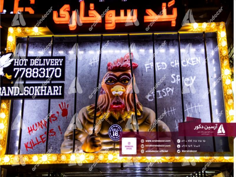ماکت تبلیغاتی خروس بزرگ در تاریخ مرداد ماه ۱۳۹۸ به مدت ۳۰ روز توسط گروه صنعتی آرسین دکور طراحی و ساخته شده است. ماکت های صنعتی و تبلیغاتی خروس بزرگ به سفارش فست فود بند سوخاری ساخته شده است. در این سازه از متریال فایبرگلاس شش لایه استفاده شده است. رنگ به کار گرفته شده صنعتی و خودرویی و مناسب جهت استفاده در فضای باز و سرپوشیده و مقاوم در برابر اشعه UV و رطوبت می باشد. تمام مراحل مدل سازی و قالبگیری ماکت های صنعتی و تبلیغاتی خروس بزرگ توسط دستگاه های CNC تمام اتوماتیک با بالاترین دقت انجام گرفته است.