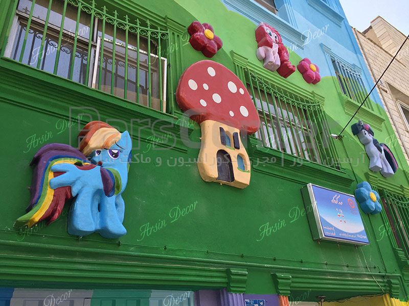 دکوراسیون نمای بیرونی مهدکودک پانیز در مجموعه آرسین دکور در مدت زمان بیست و هفت روز کاری طراحی و اجرا شده است. متریال یا جنس به کار گرفته شده در این پروژه فایبرگلاس می باشد. همین امر باعث شده در کلیه ماکت ها در برابر ضربه و رطوبت بسیار مقاوم گردد. وزن تقریبی هر یک از ماکت های اسب پونی در حدود شش کیلوگرم، ماکت رنگین کمان ده کیلوگرم، ماکت های گل پانصد گرم و ماکت قارچ بزرگ پانزده کیلوگرم می باشد. ابعاد ماکت های اسب پونی نیز در حدود نود سانتی متر ، ماکت قارچ یک متر و بیست سانتی متر و ماکت گل سی سانتی متر می باشد.در انتها این نکته یادآوری می شود گروه صنعتی آرسین دکور این توانایی را دارد این محصول و محصولات مشابه در هرنوع طرحی را در هر اندازه و هر کیفیتی که شما سفارش دهید در کمترین زمان ممکن و با بالاترین کیفیت ارائه نماید.