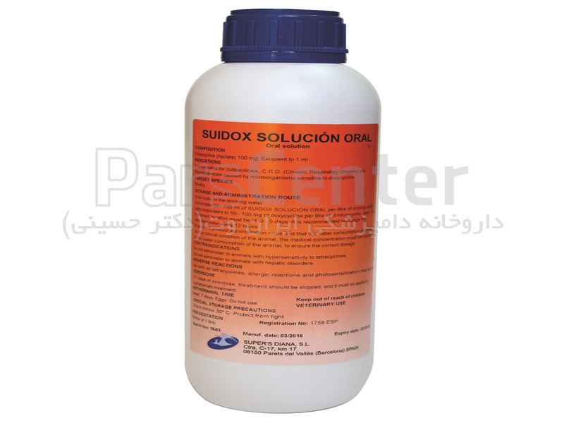 داروخانه دامپزشکی ایران وت عرضه کننده داروی سوئیداکس - داکسی سایکلین (هایکلیت) -این محصول جهت درمان کلیباسیلوز، بیماری مزمن تنفسی (CRD) و مایکوپلاسموز و میکروارگانیسمهای حساس به داکسیسایکلین توصیه میشود. جهت سفارش داروها و اطلاع از تخفیفات به کانال تلگرام ما بپیوندید و نرم افزار دام دارو را نصب نمایید.