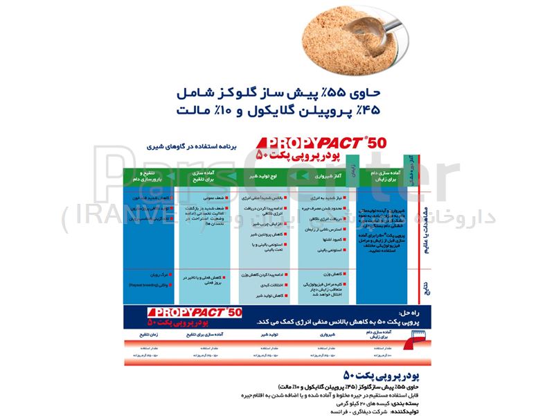 داروخانه دامپزشکی ایران وت عرضه کننده پروپی پکت ۵۰ | Propypact 50 -حاوی 55% پیش ساز گلوکز شامل 45% پروپیلن گلایکول و 10% مالت-محصول دیفاگری فرانسه جهت کمک به کاهش بالانس انرژی منفی در گاوهای تازه زا - جهت سفارش داروها و اطلاع از تخفیفات به کانال تلگرام ما بپیوندید و نرم افزار دام دارو را نصب نمایید.