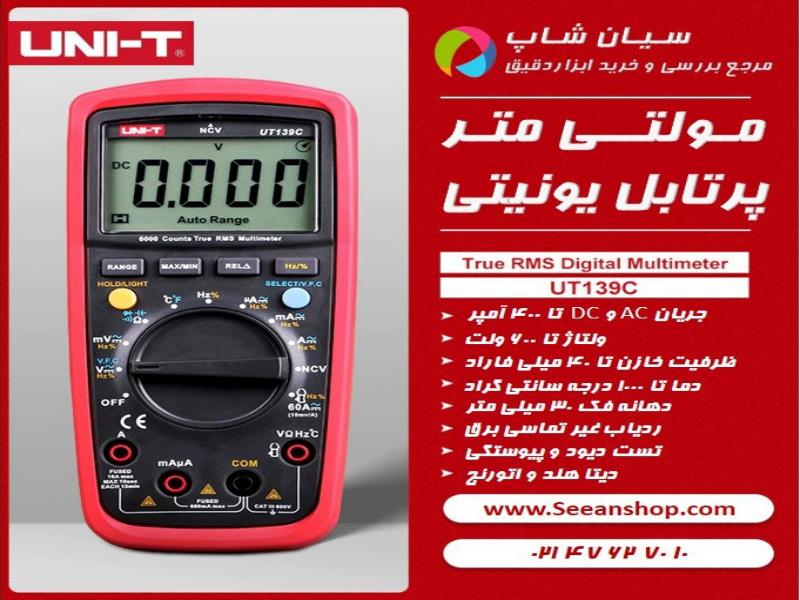 مولتی متر دیجیتال یونی تی مدل UNI-T UT-139C یک مولتی متر ارزان قیمت و با کیفیت است .این کد محصول قادر به اندازه گیری به صورت True RMS ،اندازه گیری ولتاژ متناوب تا, 600Vولتاژ مستقیم تا600V ,جریان متناوب و مستقیم تا 10A و اندازه گیری مقادیر مینیمم و ماکزیمم به همراه حالت تفاضلی ،اندازه گیری دیوتی سایکل از 0.1 تا 99.9 درصد ،تست دیود و اتصال کوتاه رنج خودکار قابلیت اتصال پراب کلمپی , واندازه گیری جریا